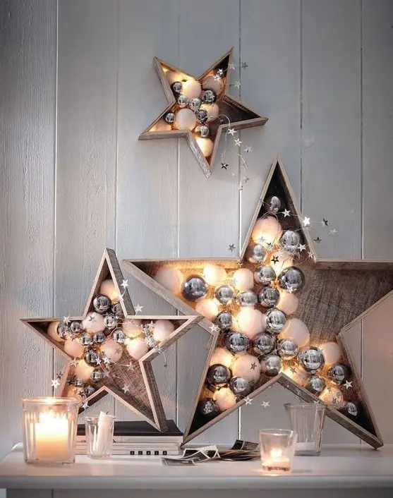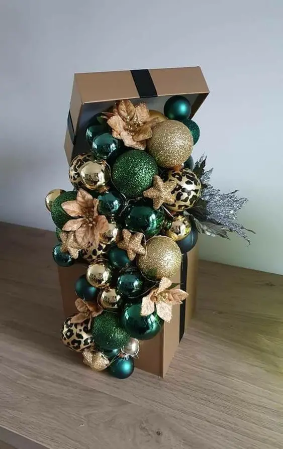 Πάρτε ένα κουτί δώρου και κολλήστε τα στολίδια έτσι ώστε να φαίνεται ότι το κουτί σκάει από αυτά και προσθέστε φωτάκια – αυτή είναι μια άλλη ωραία ιδέα.