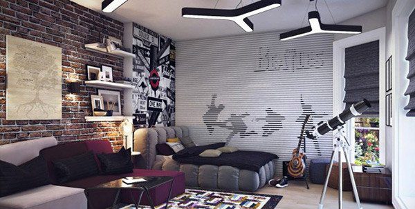 Ένα υπνοδωμάτιο κατάλληλο για έναν έφηβο. Τούβλα στους τοίχους από τη μία πλευρά και τοίχους με επένδυση για το άλλο μέρος.
