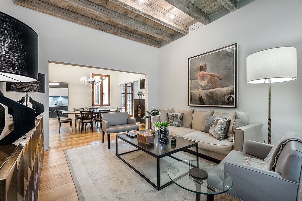 Εκτεθειμένα δοκάρια οροφής για ένα πιο ζεστό σαλόνι