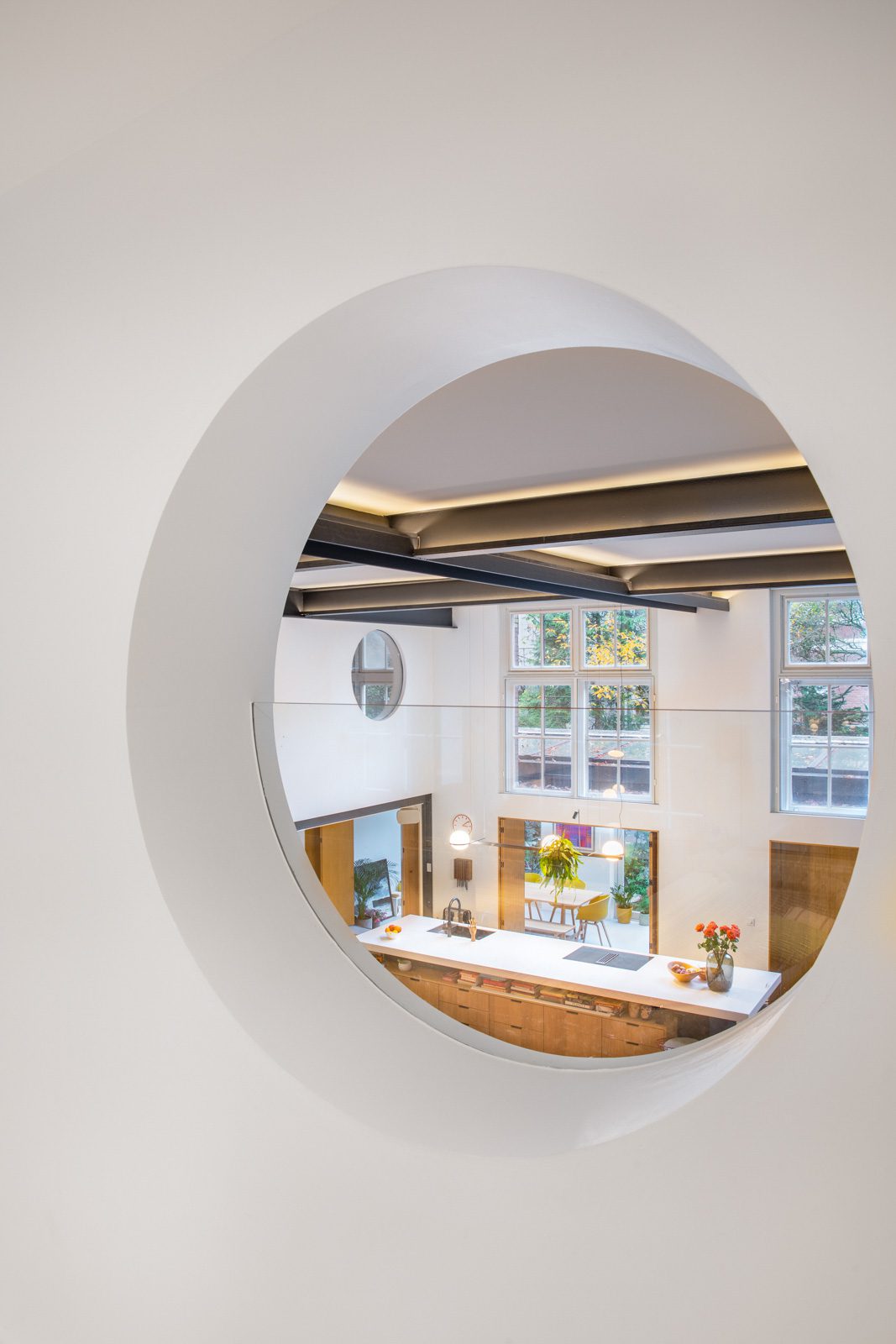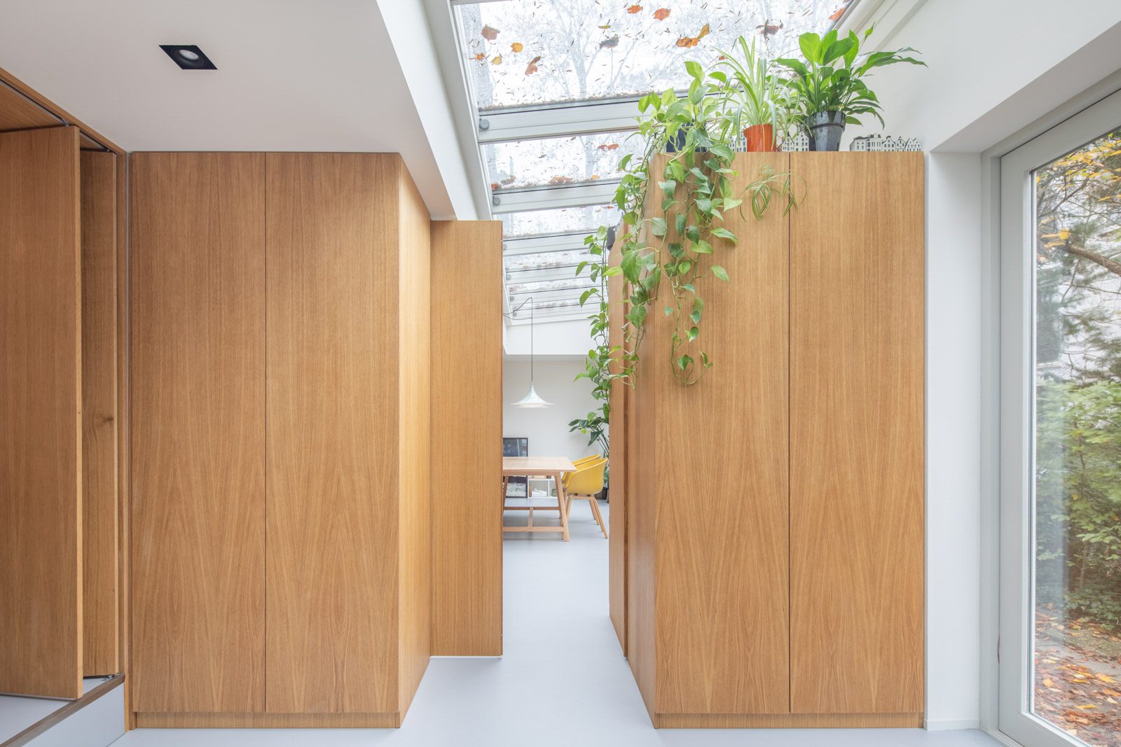 Ένας φεγγίτης διατρέχει όλο το μήκος της τραπεζαρίας και του παρακείμενου δωματίου, καλωσορίζοντας με φυσικό φωτισμό και θέα στα δέντρα. Πολύχρωμα φύλλα πέφτουν σαν κομφετί στο ποτήρι καθώς αλλάζουν οι εποχές. Τα φυτά εσωτερικού χώρου φέρνουν μια εικόνα του κήπου μέσα.