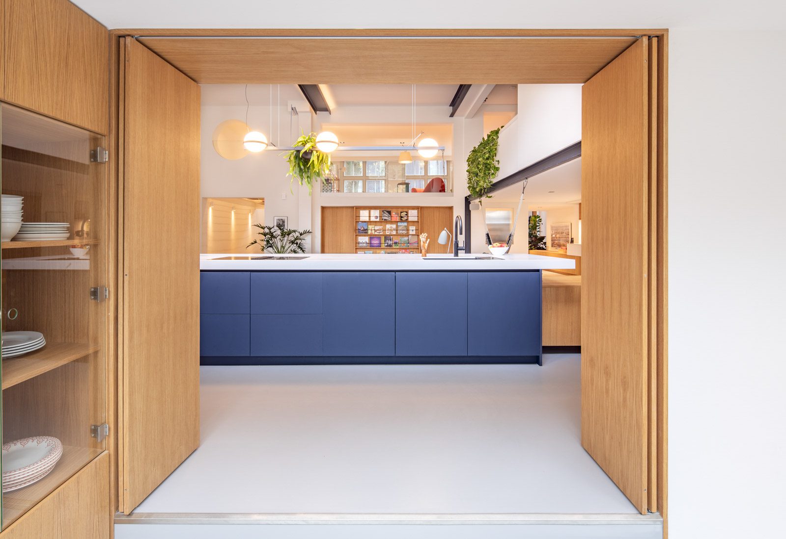 Μια εντυπωσιακή μπλε νησίδα στην κουζίνα διασχίζει τον κύριο χώρο. Το απαλό ματ φινίρισμά του Arpa Fenix καλύπτεται με λευκό πάγκο Himacs. Οι μπλε όγκοι της κουζίνας δημιουργούν μια σύγχρονη σύγκρουση με τα vintage ξύλινα ντουλάπια στο σαλόνι.
