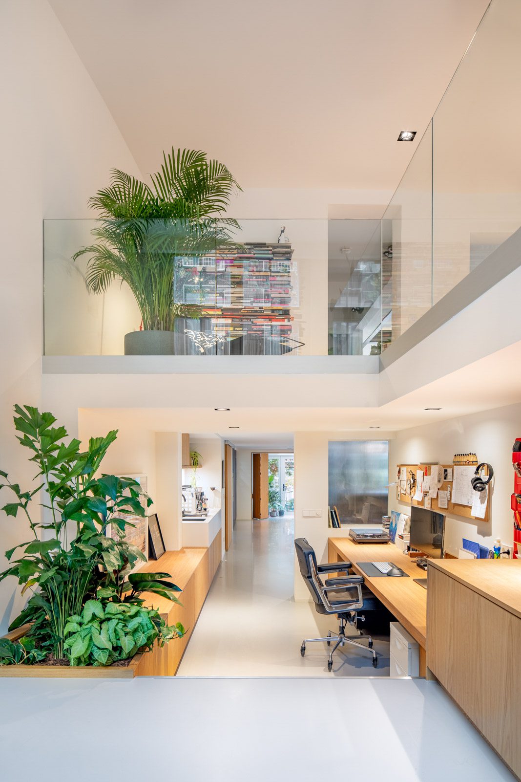 Ο μοντέρνος χώρος του γραφείου στο σπίτι απολαμβάνει τον ευάερο χαρακτήρα ενός κενού διπλού ύψους, με θέα στον ημιώροφο με γυάλινους τοίχους. Μια εντοιχισμένη ζαρντινιέρα αναπτύσσει μια πλούσια βλάστηση δίπλα στη σκάλα. Υπάρχουν λίγες πόρτες στο Urban Villa Kerkstraat. Κάθε χώρος ρέει εύκολα από τον ένα στον άλλο για να ενθαρρύνει τη συνεργασία και τη δημιουργικότητα.