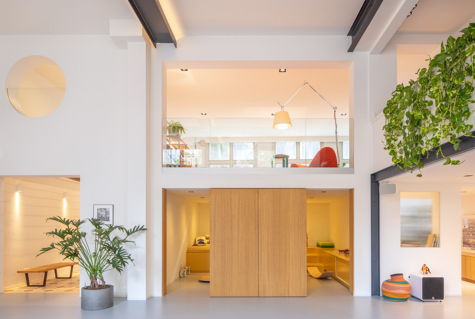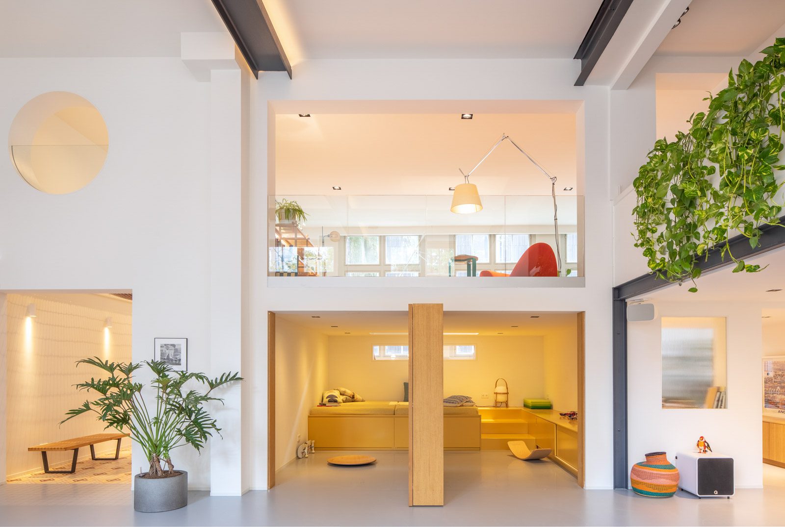 Στον επάνω όροφο, στον ευρύχωρο ημιώροφο, ένας μινιμαλιστικός χώρος διαβίωσης διαθέτει απομονωμένες γωνίες ανάγνωσης. Μια τολμηρή κόκκινη ξαπλώστρα κάτω από το ψηλό επιδαπέδιο φωτιστικό, ενώ ένας ενσωματωμένος πάγκος είναι διακοσμημένος με μπλε ηλεκτρίκ ριχτάρι. Ένα γυάλινο πάνελ διαπερνά τον ημιώροφο, προσφέροντας θέα στο δωμάτιο από κάτω.