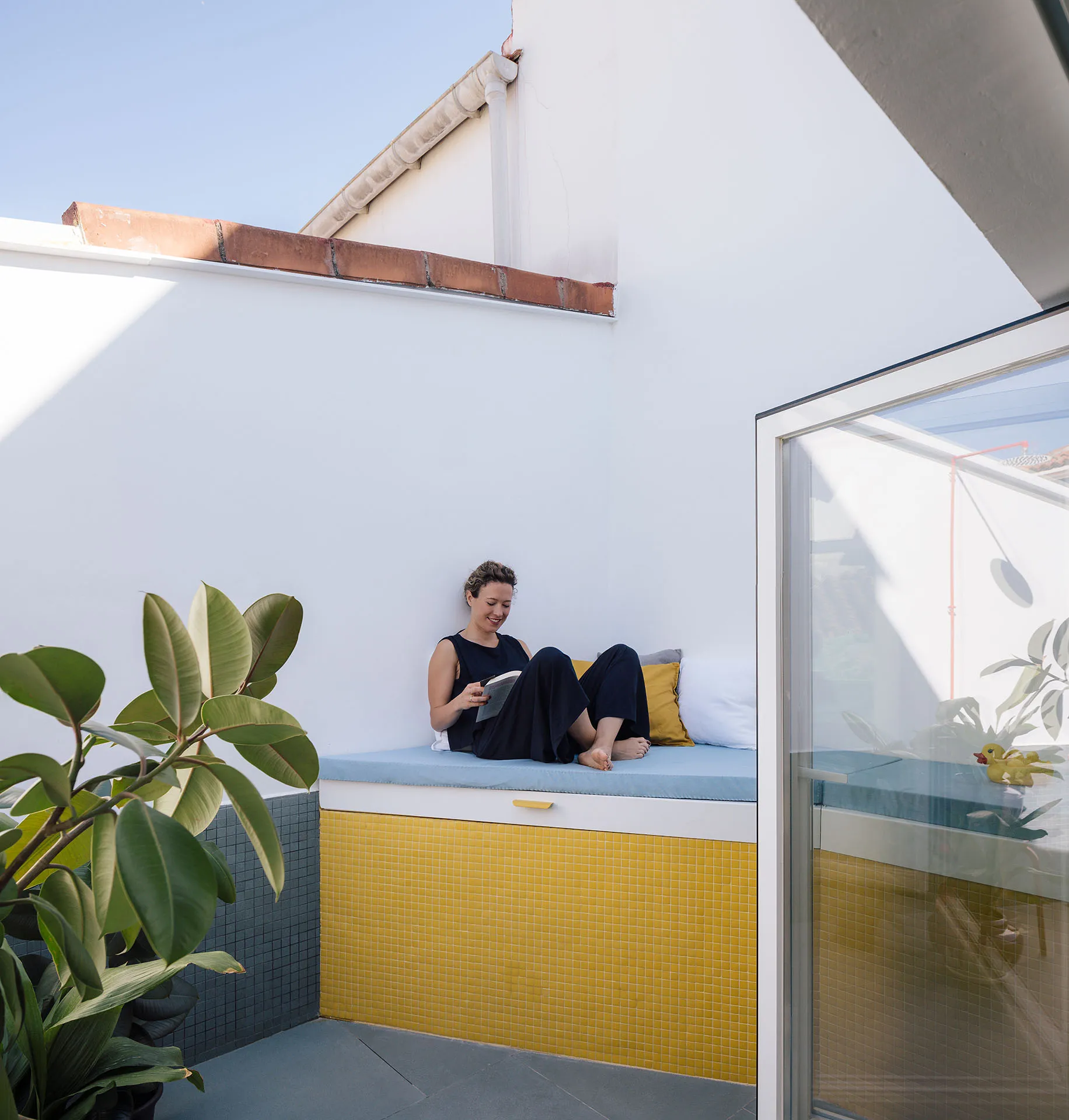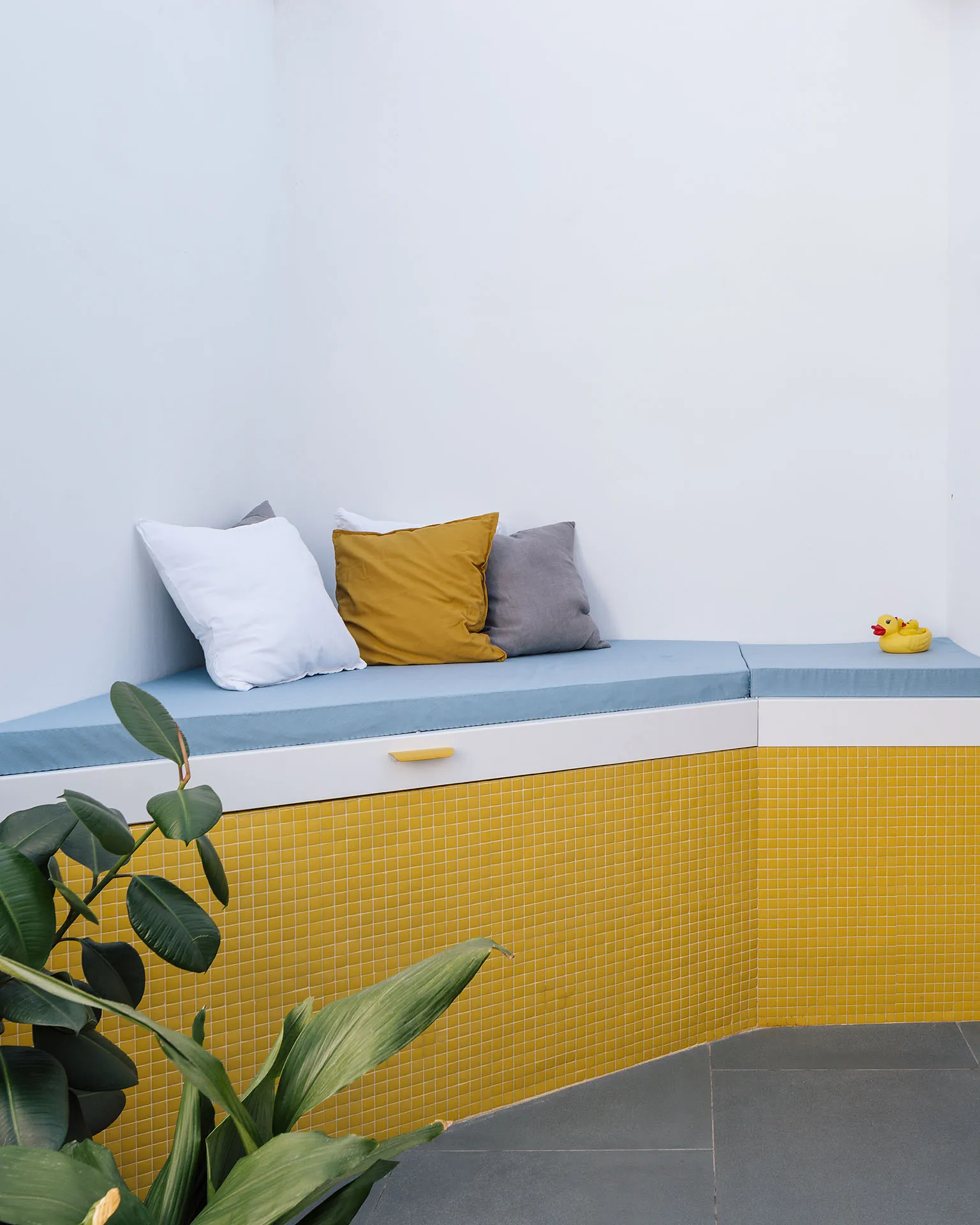 Στον συμπαγή χώρο της βεράντας, ένας εντοιχισμένος πάγκος είναι διακοσμημένος με ηλιόλουστα κίτρινα μωσαϊκά πλακάκια και ένα μπλε μαξιλάρι καθίσματος.