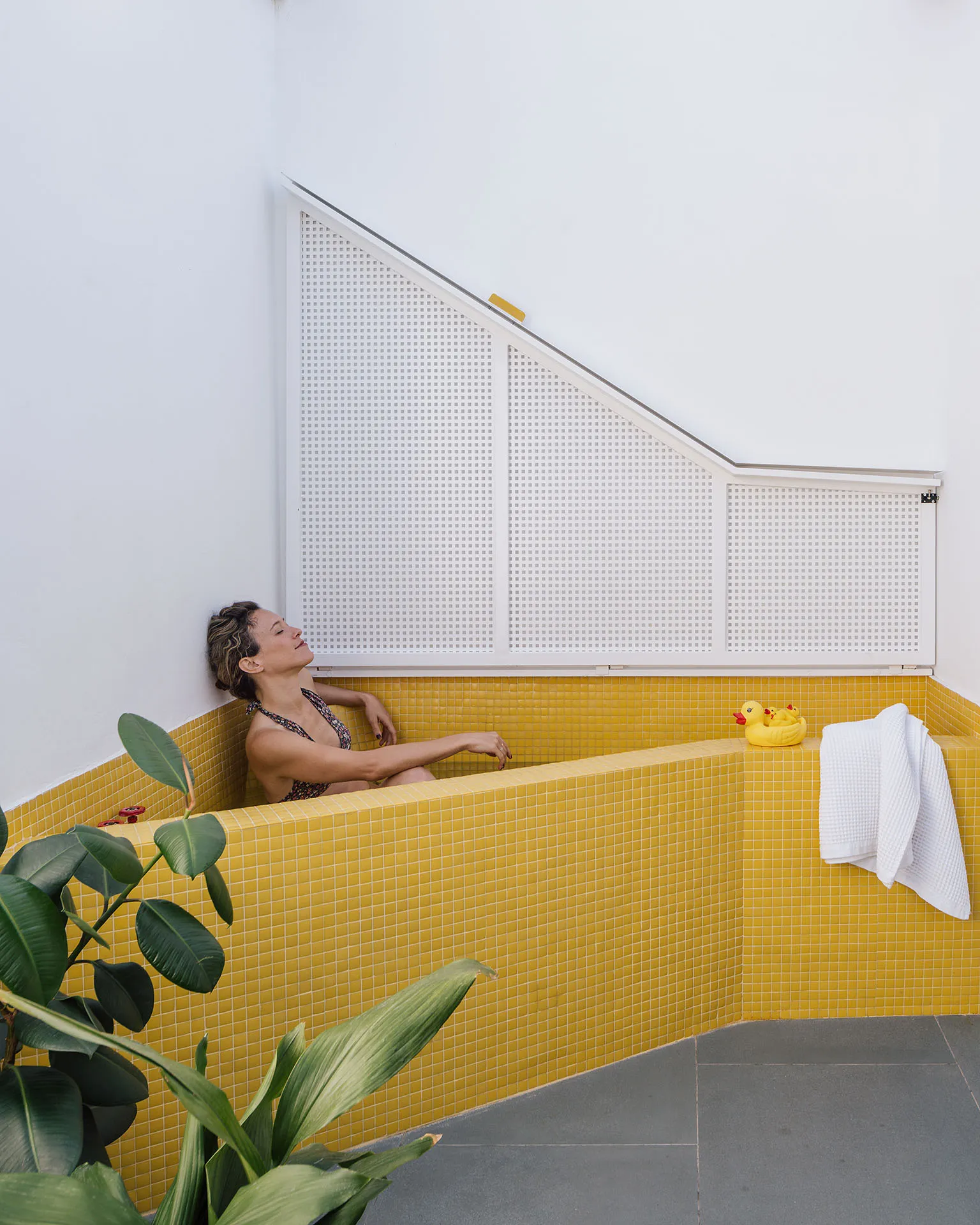Μέσα στο ιδιωτικό μπάνιο, ο νιπτήρας είναι τοποθετημένος σε ένα φωτεινό κίτρινο γωνιακό ράφι που ανοίγει τον χώρο. Τα ανοιχτά ράφια τοίχου κάνουν τα προϊόντα περιποίησης να τοποθετούνται εύκολα.
