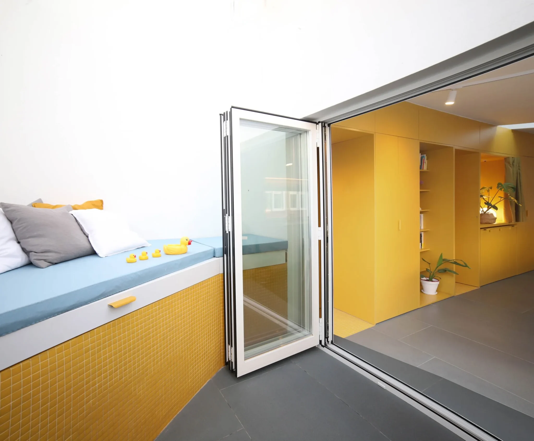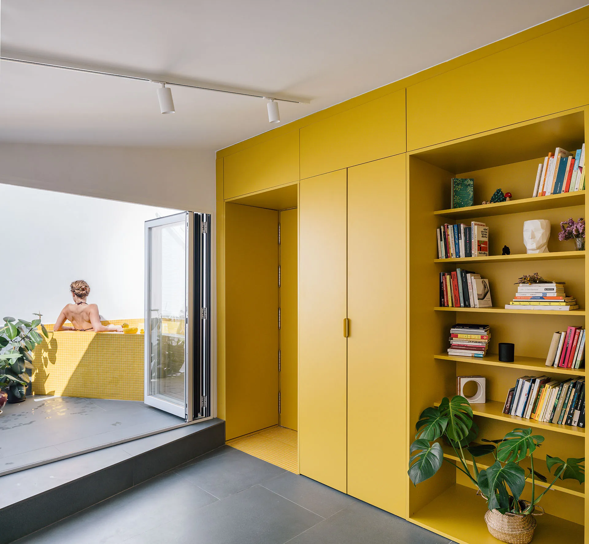 Η κίτρινη πόρτα του υπνοδωματίου βρίσκεται στο ίδιο επίπεδο με τον αποθηκευτικό τοίχο.