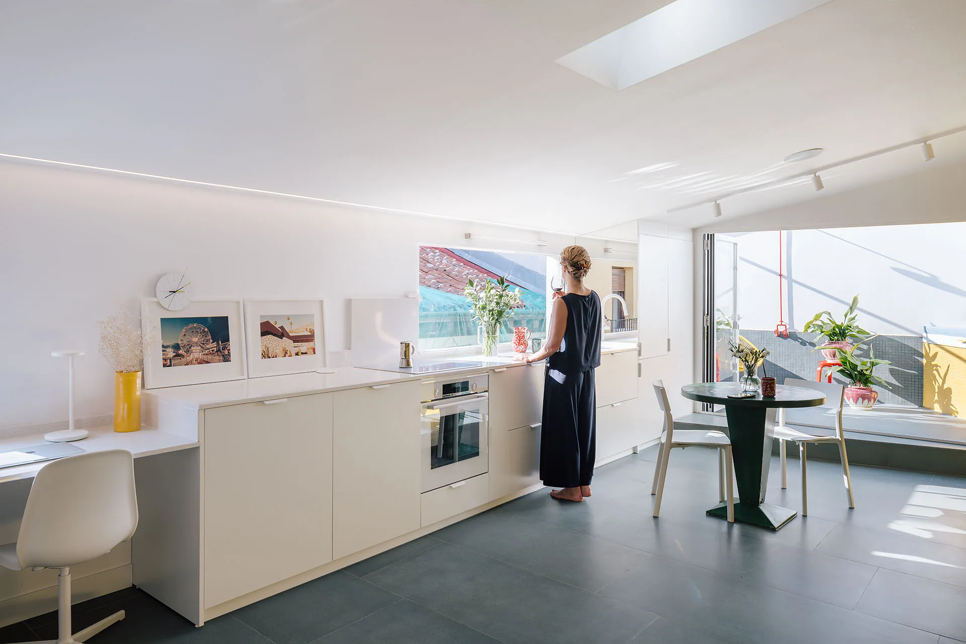 Η πλειοψηφία των κουφωμάτων στο διαμέρισμα εξυπηρετεί πολλαπλούς ρόλους, προσφέροντας νέες πτυχές στο εσωτερικό. Στη συμπαγή βεράντα, το πολυλειτουργικό θέμα συνεχίζεται με έναν πάγκο που μετατρέπεται σε εξωτερική μπανιέρα.