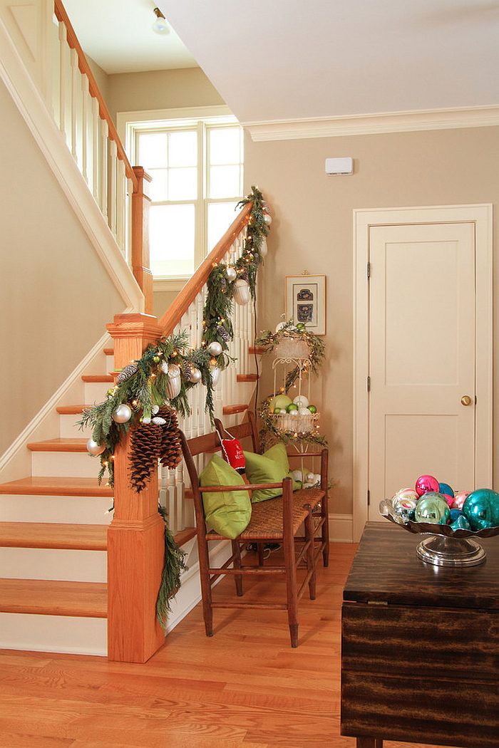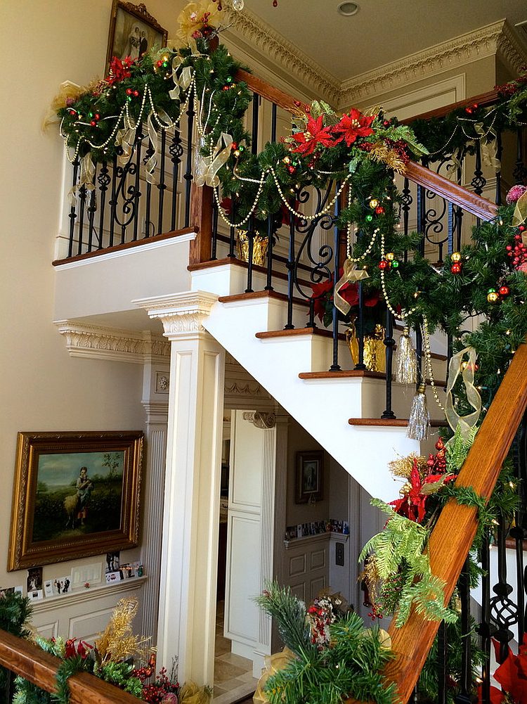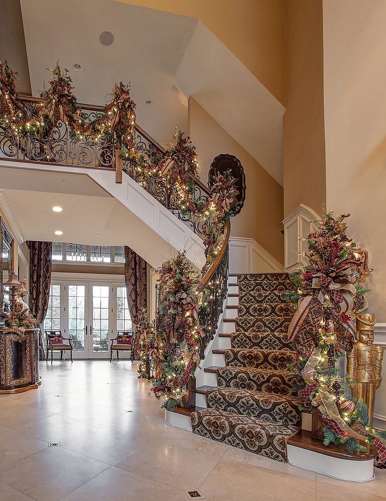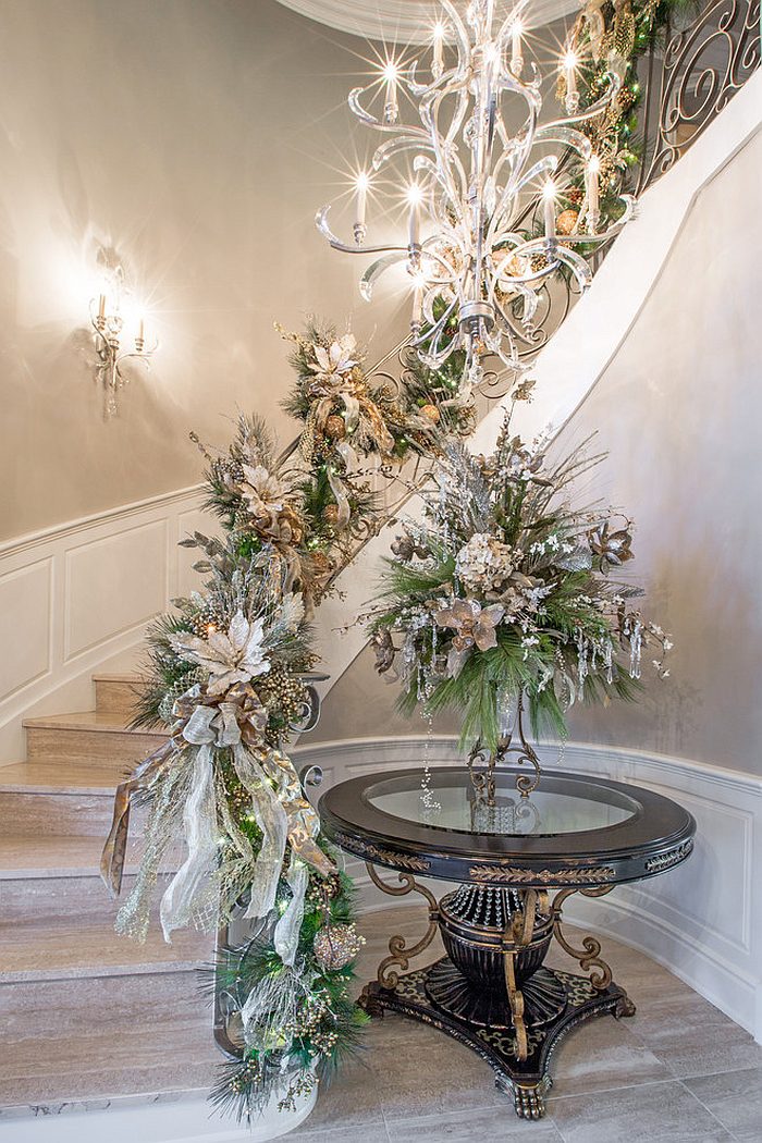 Αν εξακολουθείτε να παραμένετε στη δοκιμασμένη εμφάνιση με πράσινες γιρλάντες και αφρώδεις κόκκινες διακοσμήσεις για τη σκάλα, κάντε το με πολλή δόξα! Οι μεταλλικές πινελιές είναι μεγάλη επιτυχία αυτή την περίοδο των διακοπών και μπορείτε να τις ενσωματώσετε στη διακόσμηση της σκάλας σας, καθώς και με λαμπρά χρυσά και ασημένια στολίδια. Στην πραγματικότητα, μπορείτε να ακολουθήσετε την παραδοσιακή προσέγγιση διακόσμησης και να μεταβείτε εντελώς σε ένα σχέδιο χρυσού χρώματος για να δώσετε στη σκάλα μια μαγευτική εικόνα και γοητεία. Κομψά στεφάνια DIY και διακοσμήσεις που συμπληρώνουν το εορταστικό χριστουγεννιάτικο δέντρο σας δίπλα στις σκάλες δίνουν σε ολόκληρο το εσωτερικό μια πιο συνεκτική και γοητευτική ατμόσφαιρα.