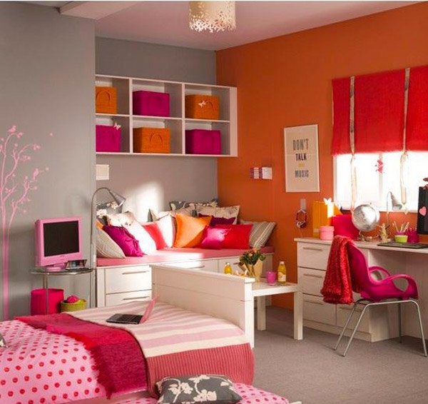Πολύχρωμη κρεβατοκάμαρα για κορίτσια με συνδυασμό του πορτοκαλί, ροζ, και φουξ.