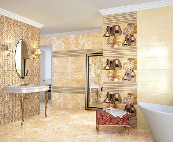 Τα ψηφιδωτά πλακάκια που χρησιμοποιούνται στο δάπεδο και στους τοίχους δημιουργούν μια τραχιά υφή σε αντίθεση με την ομαλότητα της μπανιέρας.
