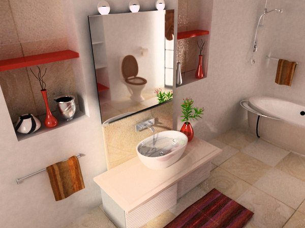#3 Μπεζ μπάνιο με κόκκινα διακοσμητικά και ράφια