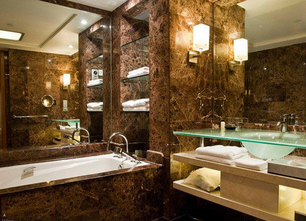 Τα φώτα που χρησιμοποιούνται, καθώς και ο καθρέφτης που είναι τοποθετημένος στους τοίχους αποκαλύπτουν το φινίρισμα του σκούρου καφέ μαρμάρου.