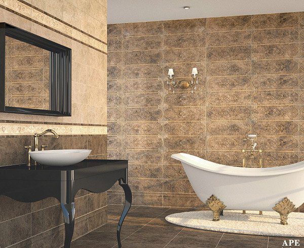 Καφέ πλακάκια μπάνιου με ιδιαίτερο μοτίβο, που συνδυάζονται με μικρότερα πιο σκούρου χρώματος.