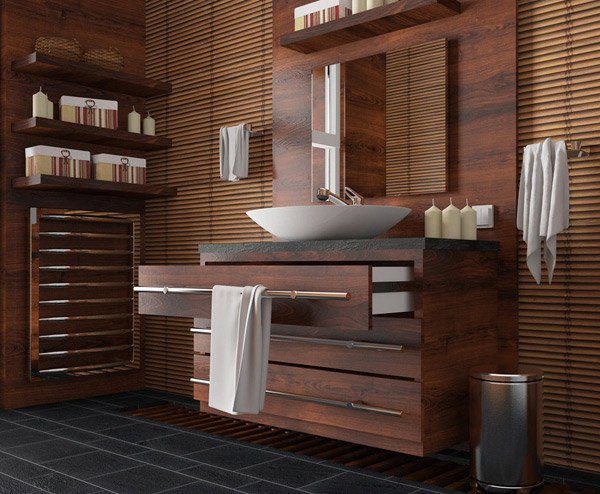 Οι διαφορετικές μορφές, τα σχήματα και οι υφές εδώ είναι πολύ αποτελεσματικές για τη δημιουργία ενός μπάνιου διακοσμημένου από ξύλο.