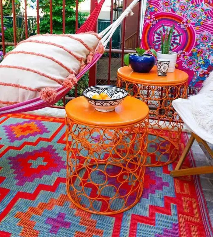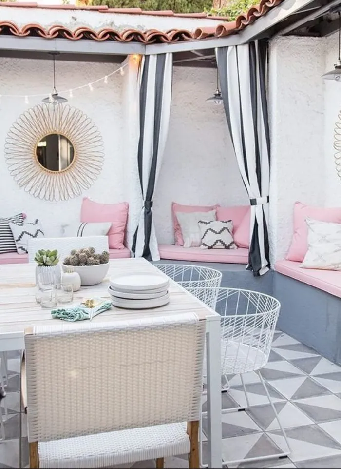 Το χρώμα είναι απαραίτητο, αλλά και η ανάμειξη υφασμάτων. Ταπετσαρίες σε κάθε χώρο. Το Boho είναι ένα άλλο κλειδί που δεν μπορούμε να παραλείψουμε. Το ότι είμαστε στους εξωτερικούς χώρους δεν σημαίνει ότι έχουμε να κάνουμε χωρίς κλωστοϋφαντουργικά προϊόντα.