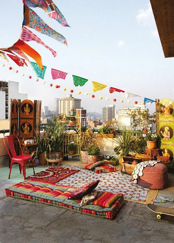Επωφεληθείτε για να δημιουργήσετε ένα ουράνιο τόξο στον εξωτερικό σας χώρο, γεμάτο ζωηρά χρώματα. Είναι αλήθεια ότι το Boho στυλ έχει μια ορισμένη αφοσίωση σε μια παλέτα χρωμάτων μεταξύ καφέ και κόκκινου, αλλά μπορεί άνετα να τα ανακατεύει με πράσινα, με κίτρινα (περισσότερο μουσταρδί από κίτρινο λεμονιού) ή με μπλε και ακόμη και τριανταφυλλή.