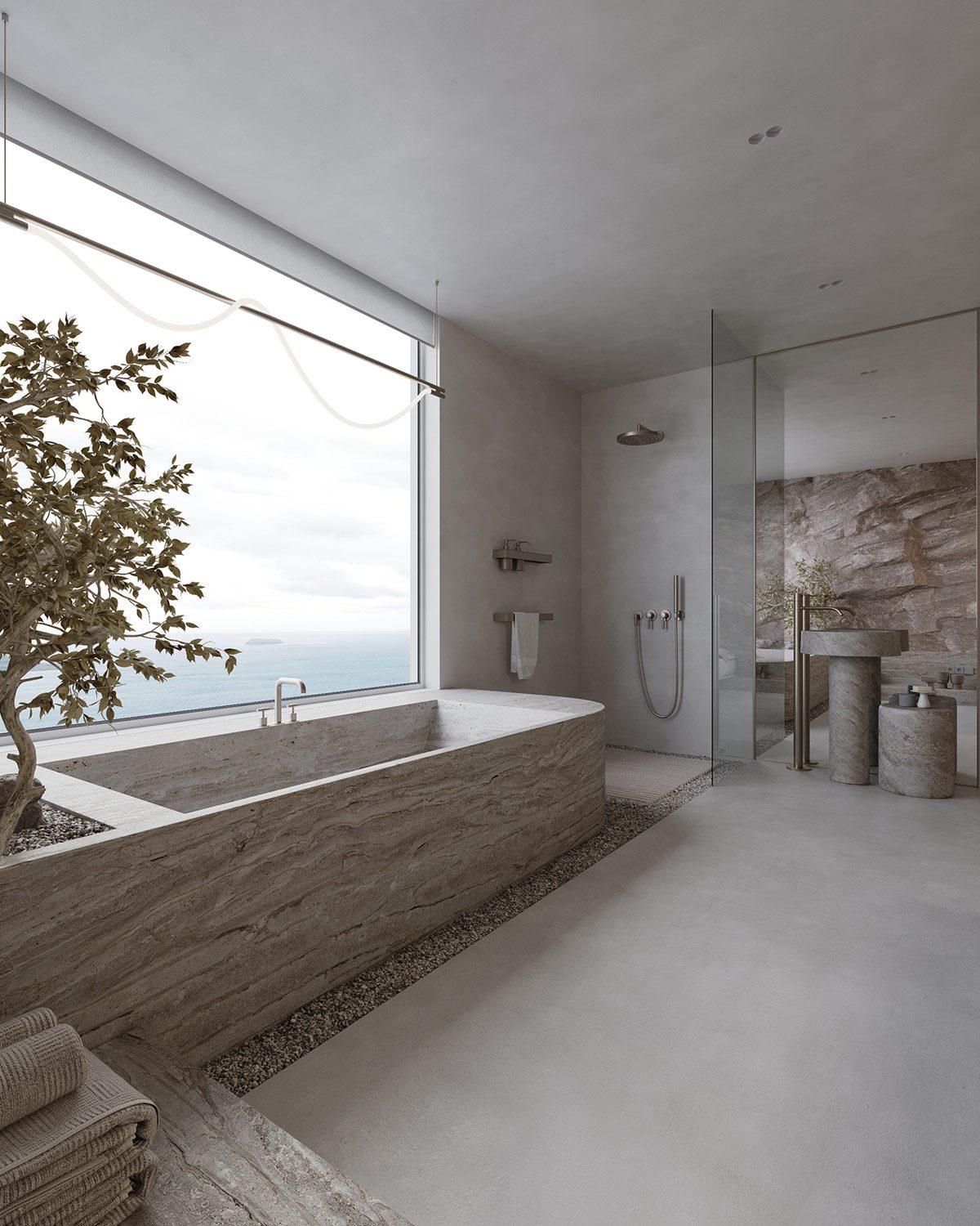 Δημιουργήστε ένα διάδρομο υγρής ζώνης προς την μπανιέρα εγκαθιστώντας το χώρο του ντους σας ακριβώς μπροστά. Εδώ, η μπανιέρα είναι προσβάσιμη μέσω μιας κομψής πέτρινης σκάλας.