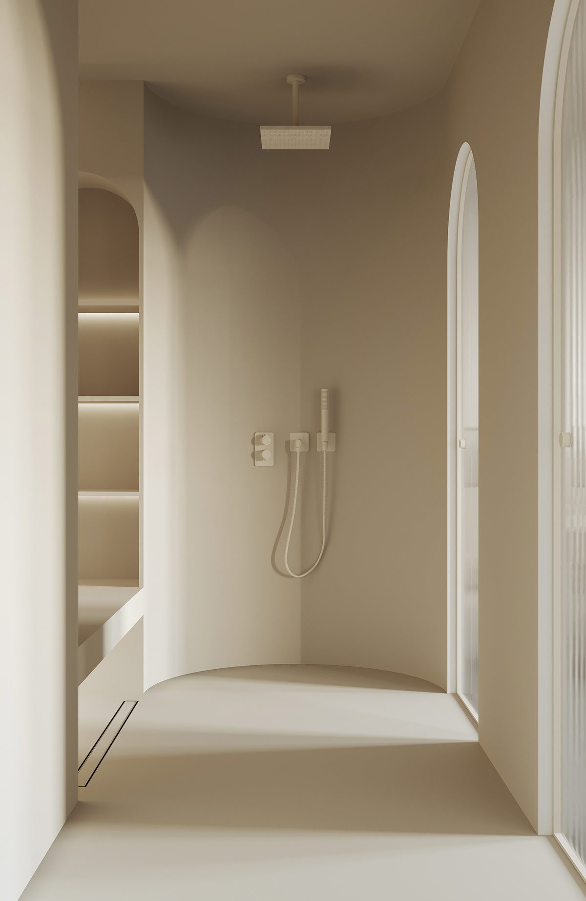 Αυτός ο φαρδύς, γυάλινος χώρος ντους διέπει το μπάνιο και νεανίζει την μπανιέρα και τους χώρους νιπτήρα γύρω του. Η καμπίνα ντους έχει φωτεινή και καταπράσινη θέα από ένα παράθυρο από το δάπεδο μέχρι την οροφή που βλέπει σε έναν ιδιωτικό κήπο.