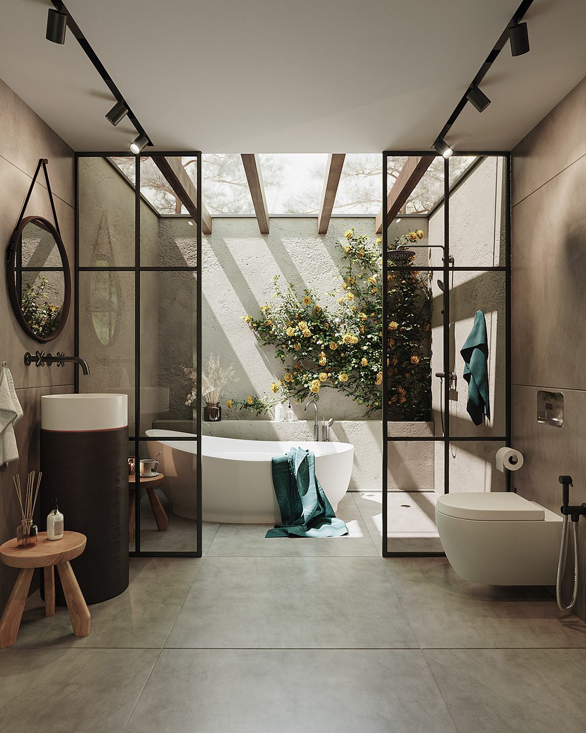 Γιατί να φτιάξετε μια απλή καμπίνα ντους όταν μπορείτε να δημιουργήσετε μια μίνι αυλή για ντους; Προσθέστε ένα φεγγίτη για να γεμίσετε το χώρο σας με φυσικό φως της ημέρας και γεμίστε με φυτά εσωτερικού χώρου που θα ανθίσουν στο φωτεινό και υγρό περιβάλλον.
