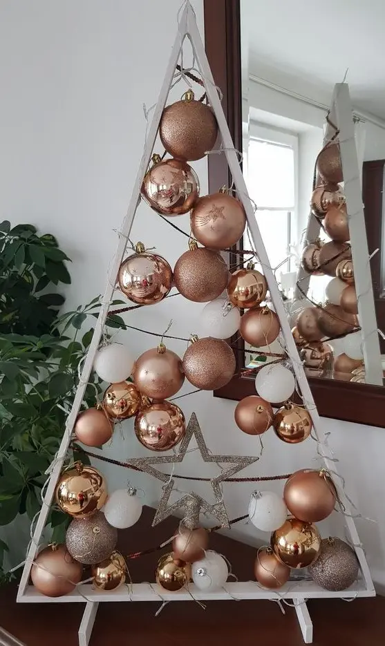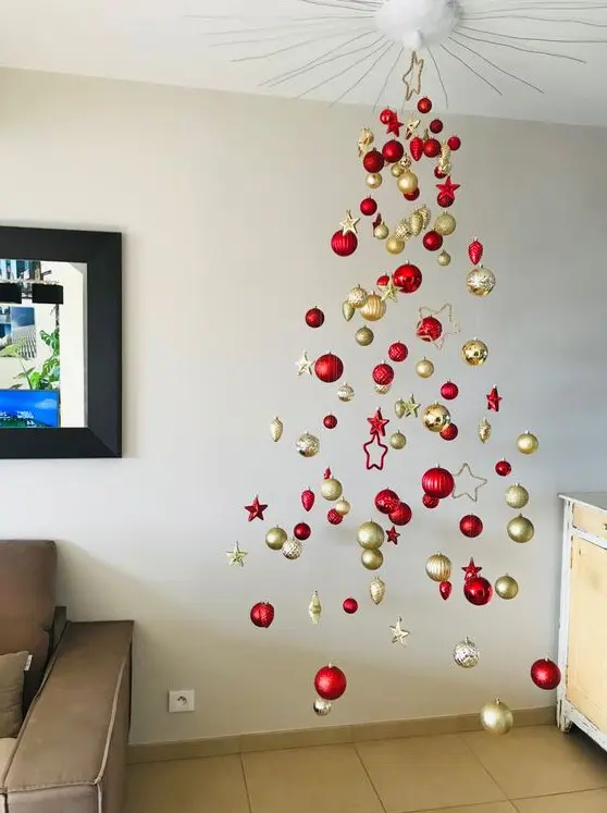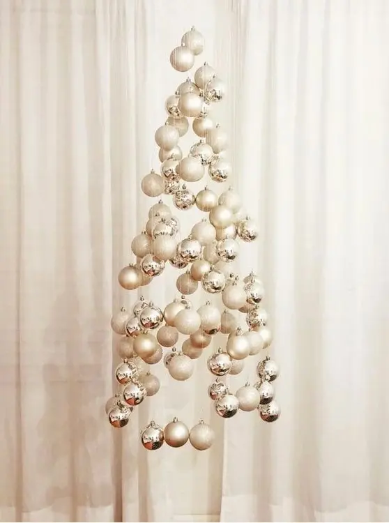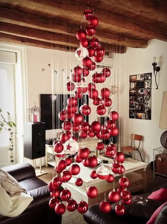 Ένα αιωρούμενο ή κρεμαστό χριστουγεννιάτικο δέντρο είναι μια ωραία ιδέα αν θέλετε ένα πολύ μοντέρνο κομμάτι και είστε έτοιμοι να αφιερώσετε χρόνο για να το σχεδιάσετε. Πάρτε λίγο σύρμα και κρεμάστε στολίδια στον αέρα – αυτό θα φανεί απίστευτο!