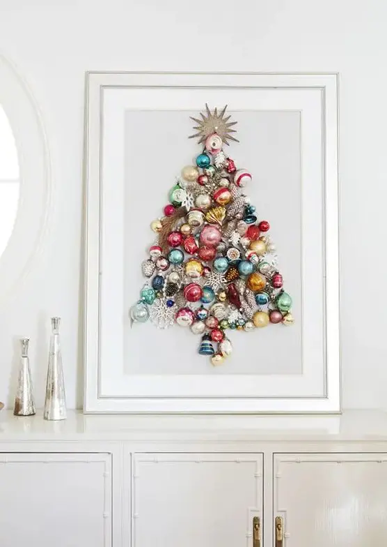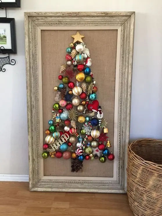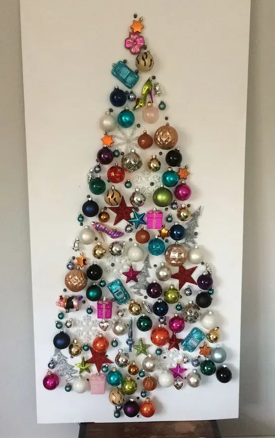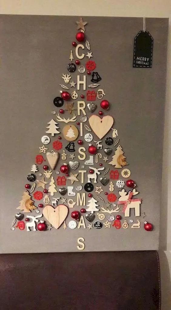 Φτιάξτε μια όμορφη τέχνη τοίχου χριστουγεννιάτικου δέντρου, χρησιμοποιώντας στολίδια, μικρές φωτογραφίες, γράμματα, χάντρες, καρφίτσες και οποιοδήποτε άλλο ντεκόρ σας αρέσει – υπάρχουν πολλές πληροφορίες στο youtube για να σας δείξουν πώς να το κάνετε.